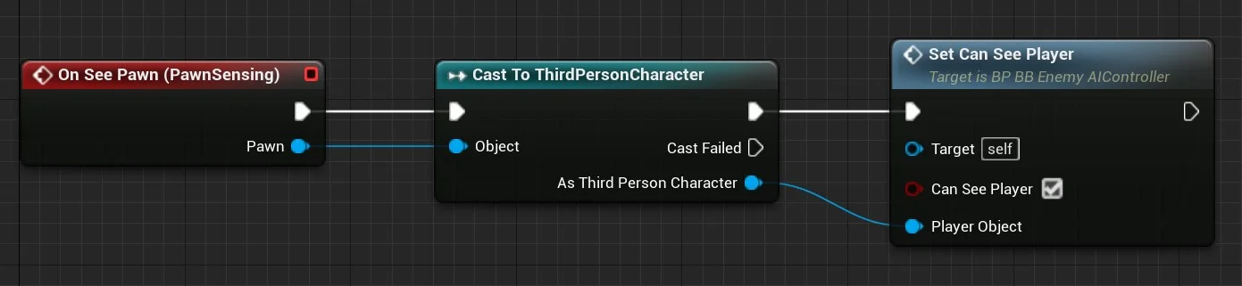Since the project I am using is the Third Person template project, the player character uses the ThirdPersonCharacter Blueprint, that is why we are casting the Pawn parameter from the On See Pawn event to the ThirdPersonCharacter.