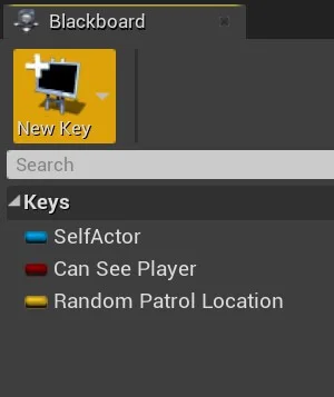 Click on the New Key icon and create two new keys, one will be a bool named Can See Player, and the other will be a Vector named Random Patrol Location: